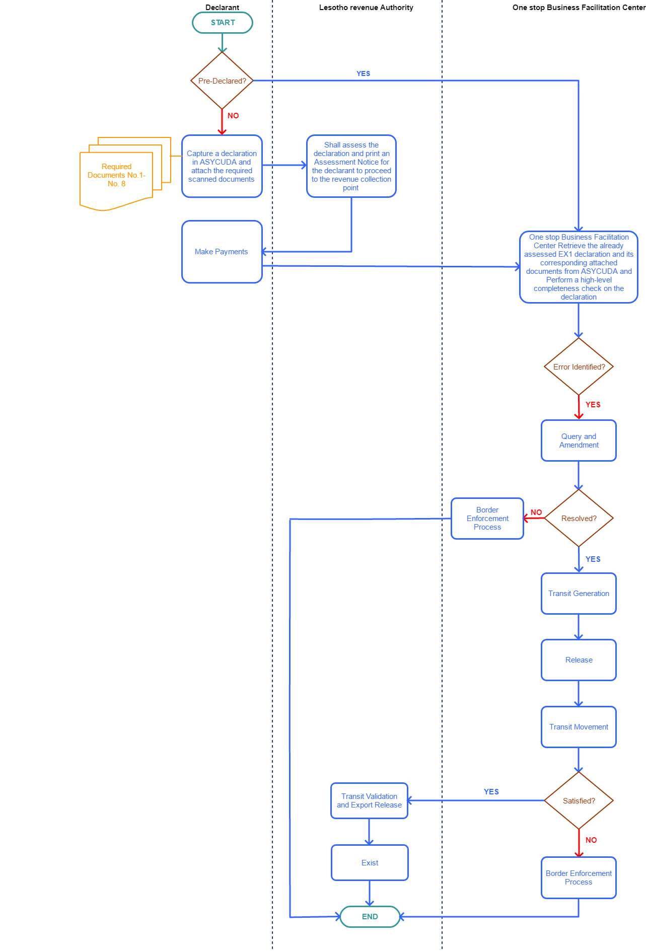 Upon entry into and exit out of Lesotho, an importer/exporter is required to make a written declaration of goods and services regardless of their value. All goods are subject to examination by the LRA Customs. The declaration is made using official a declaration form that is used and accepted in whole of the Southern African Customs Union (SACU)1 region. | Extra-SACU export goods are cleared at the One-Stop Business Facilitation Centre (OBFC) before they can be allowed for export | Customs and Excise Act No. 10, 1982 | 31-12-9999 | Good |