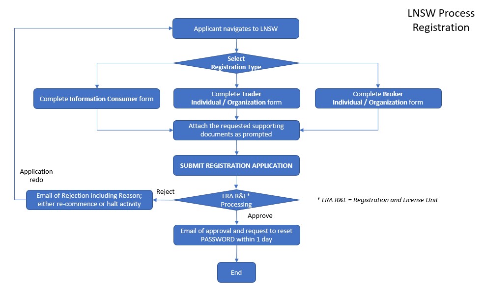 The diagram below describes the registration process steps and further information and contact details can be found at the Help Desk Contact Information on the LNSW homepage.